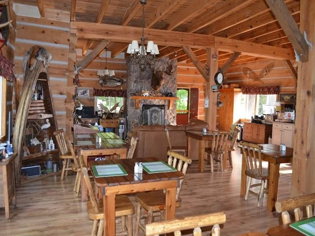 The Main Lodge is the heart of our camp — a warm, welcoming space built with solid log construction, hardwood floors, and a stunning stone fireplace. Its open-concept design features cozy seating around the fireplace and a spacious dining area furnished with log tables and chairs, where we serve delicious breakfasts and dinners daily.